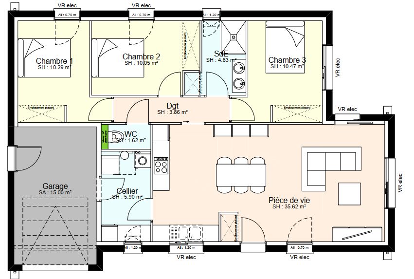 Maison de plain-pied de 83 m² habitables et 15 m² de garage.
