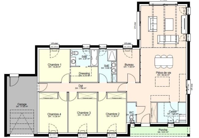 Maison RDC de 133 m² habitables et 18m² de garage. Maison 4 chambres et 1 bureau avec un séjour salon cuisine de 50m². Plan modulable. Maison basse consommation RE 2020, chauffage plancher chauffant. Contactez nous pour plus d'informations.
