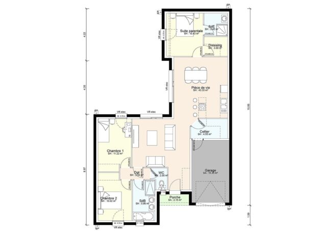 Classique et fonctionnelle ! Votre maison plain-pied à partir de 96 m2 habitable vous apporte une grande pièce de vie de 43 m2 avec cellier isolé, cuisine et coin repas attenant. Salon indépendant. 2 grandes baies coulissantes exposées sur la terrasse arrière vous offrent luminosité et confort. Vous disposez de 3 chambres dont une avec une salle d’eau toute équipée avec meuble vasque et douche. La salle de bain est aménagée avec meuble 2 vasques, une grande douche et une baignoire. Garage attenant de 15 m2. Orientation salon et pièce de vie principale exposées sur la terrasse à l’arrière. Carrelage grand format compris dans toute les pièces (hors chambres) et faïence au choix dans une large gamme disponible.