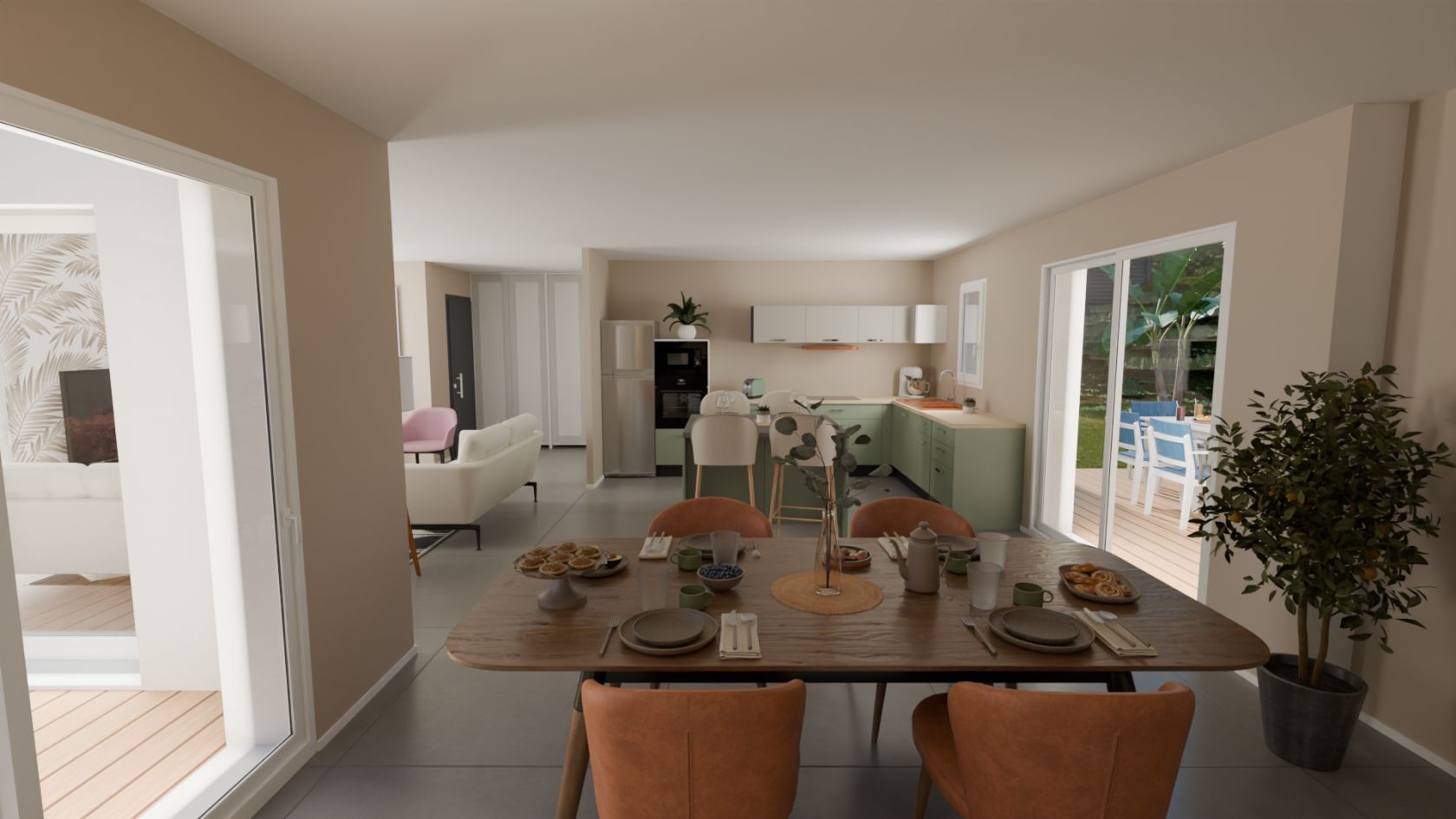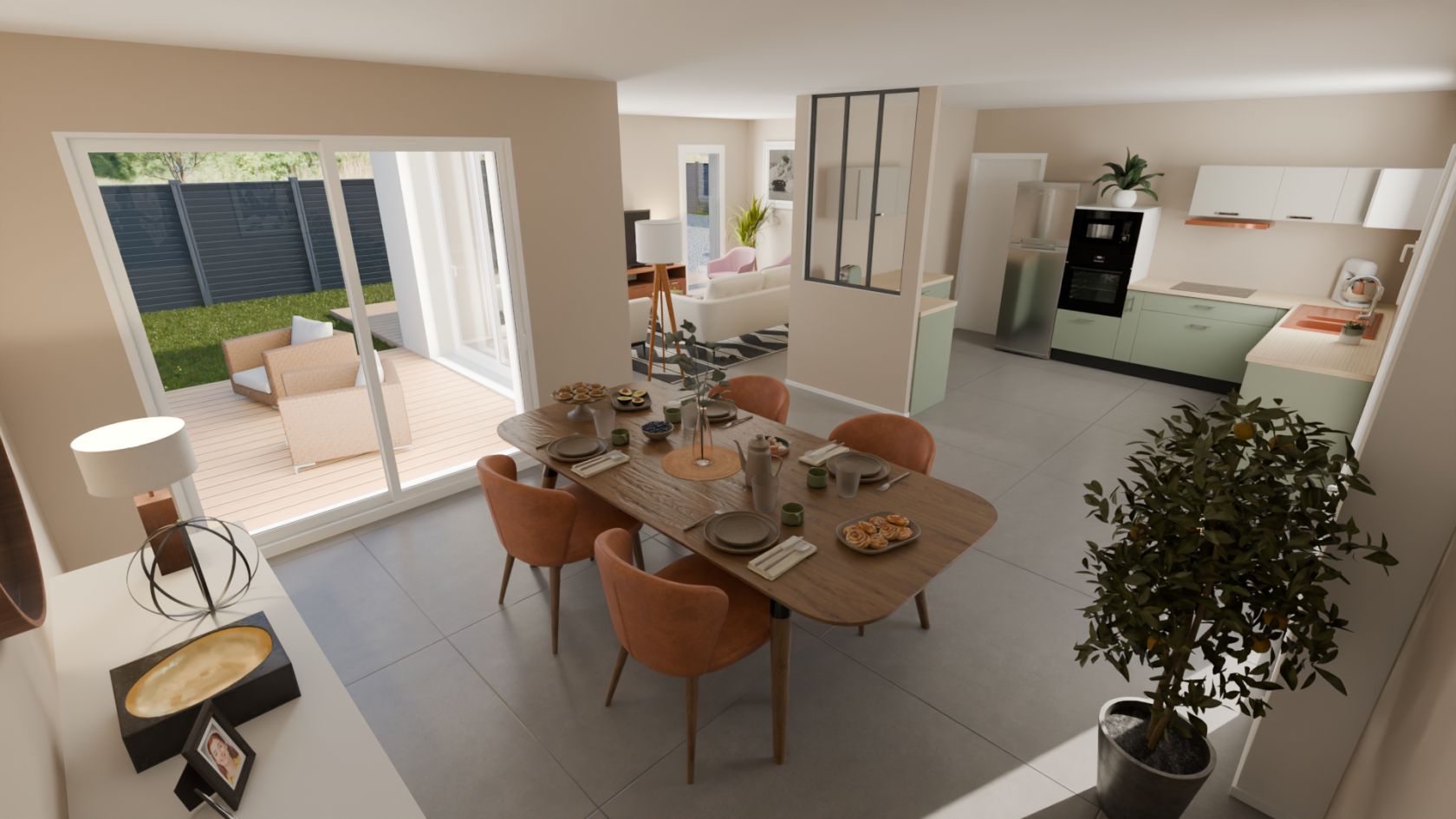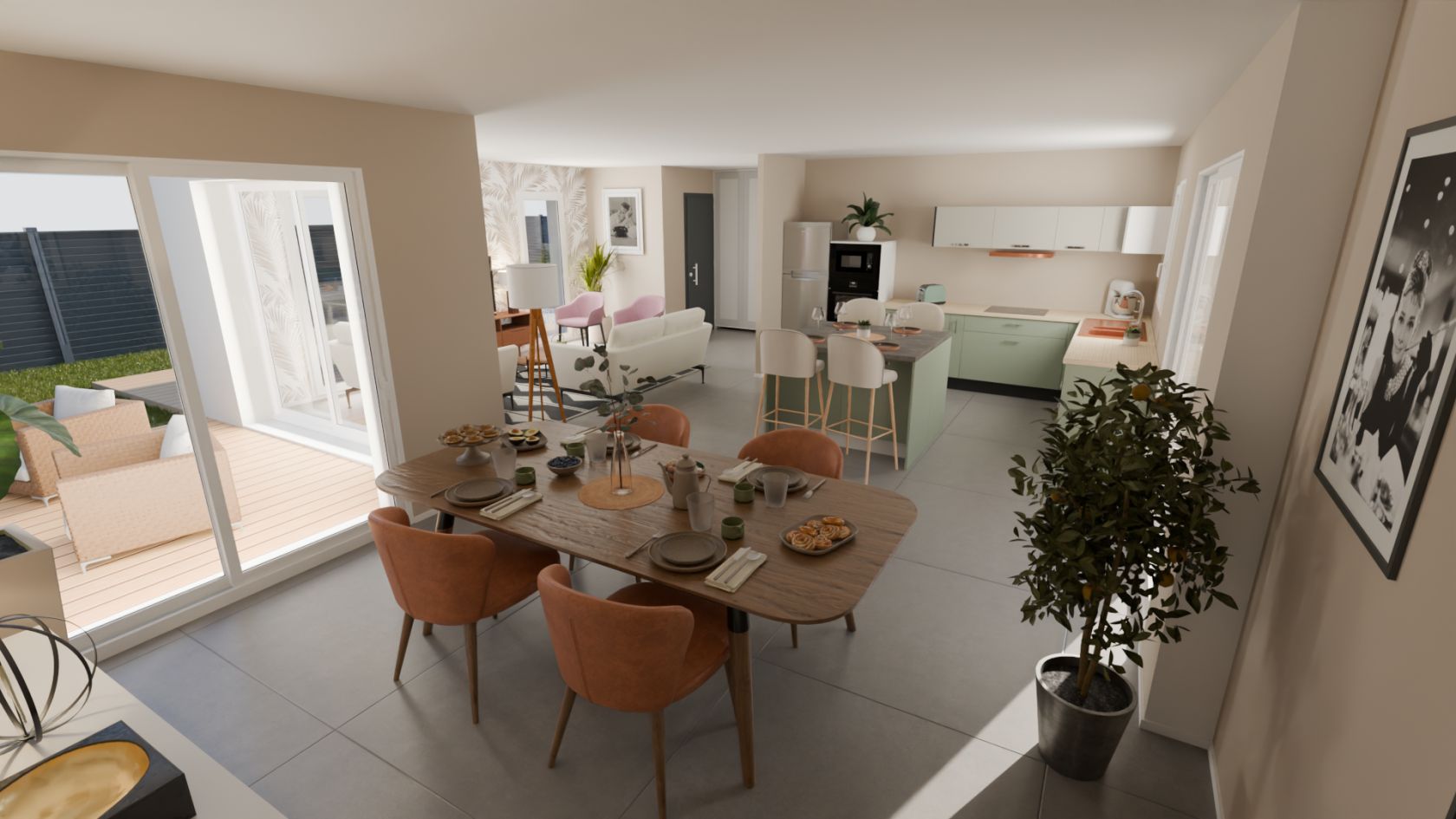 Profitez d’une spacieuse pièce de vie traversante de 54 m², baignée de lumière grâce à une grande baie vitrée, avec cuisine ouverte et cellier isolé pour plus de confort au quotidien.