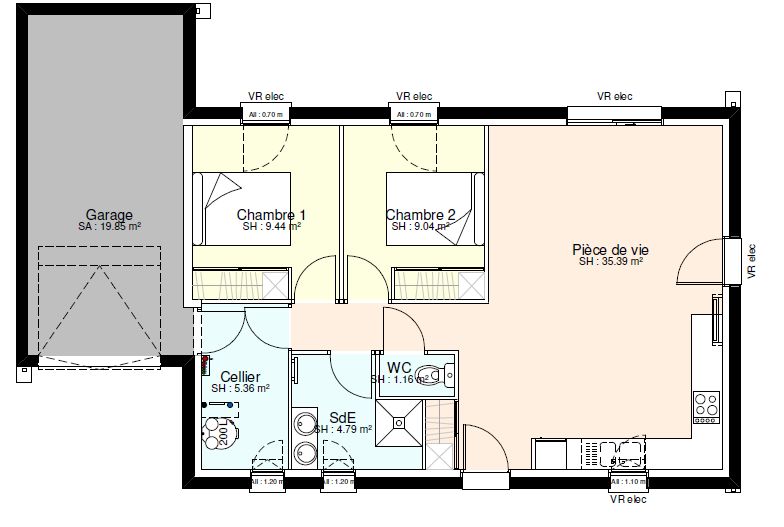 Maison RDC de 65 m² habitables et 20m² de garage. Maison 2 chambres avec un séjour salon cuisine de 36m². Plan modulable. Maison basse consommation RE 2020, chauffage avec rafraichissement . Contactez nous pour plus d'informations.