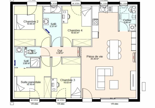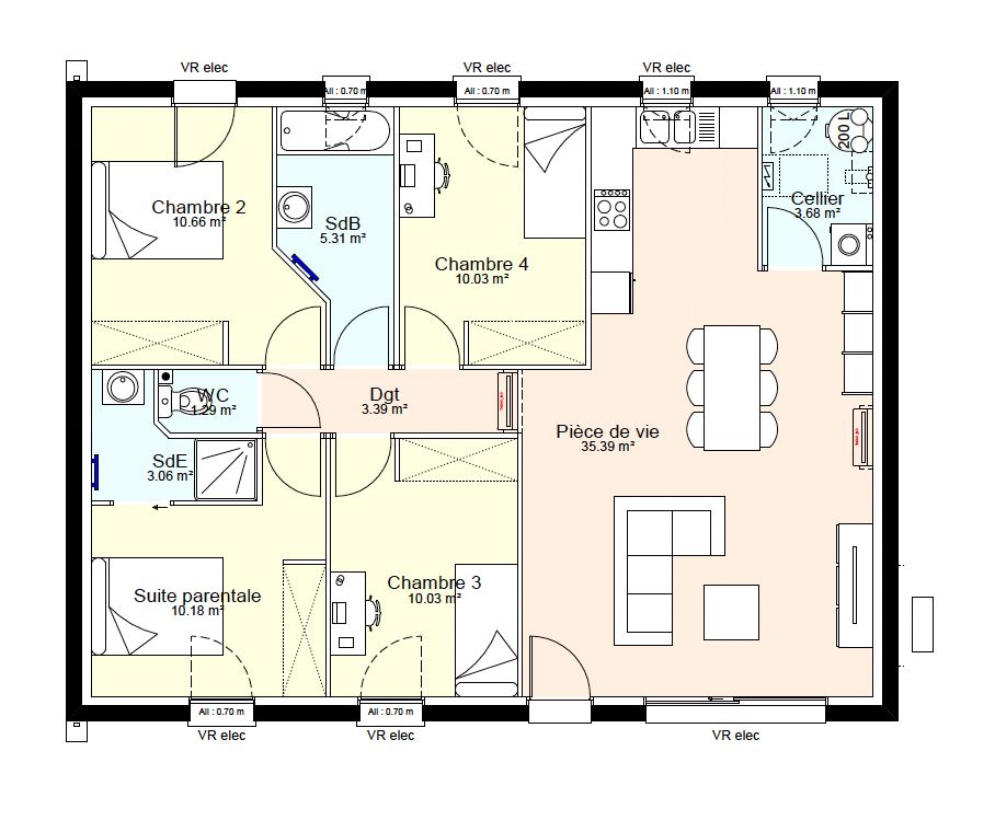 La ligne EVOLUTION vous offre une maison plain-pied dès 93 m² habitables, pensée pour s’adapter à votre style de vie. Profitez d’une pièce de vie traversante à partir de 35m², baignée de lumière grâce à une grande baie vitrée, avec cuisine ouverte et cellier isolé pour plus de praticité. Ce modèle se compose de 4 chambres dont une suite parentale offrant confort et intimité. À l’extérieur, choisissez un garage, un préau ou un carport attenant d’une surface de 15m², parfait pour stationner ou profiter des beaux jours.