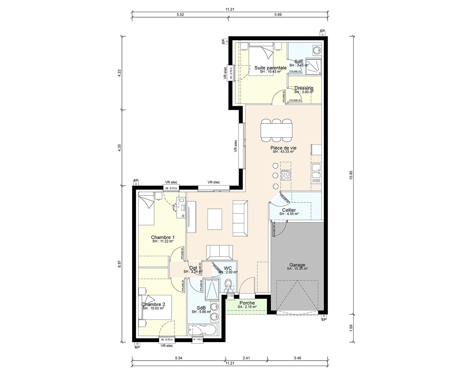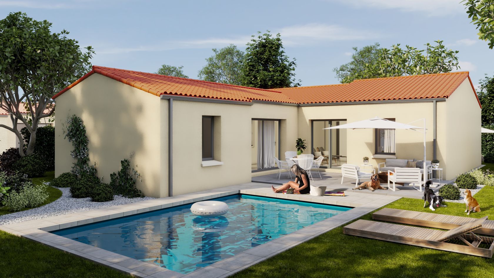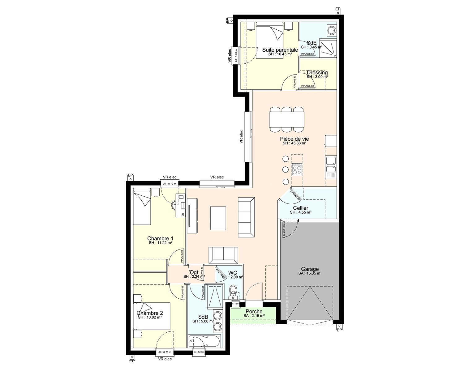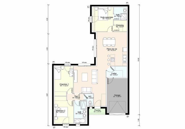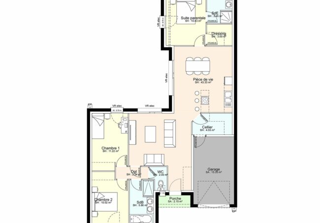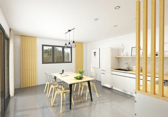 Classique et fonctionnelle ! Votre maison plain-pied à partir de 96 m2 habitable vous apporte une grande pièce de vie de 43 m2 avec cellier isolé, cuisine et coin repas attenant. Salon indépendant. 2 grandes baies coulissantes exposées sur la terrasse arrière vous offrent luminosité et confort. Vous disposez de 3 chambres dont une avec une salle d’eau toute équipée avec meuble vasque et douche. La salle de bain est aménagée avec meuble 2 vasques, une grande douche et une baignoire. Garage attenant de 15 m2. Orientation salon et pièce de vie principale exposées sur la terrasse à l’arrière. Carrelage grand format compris dans toute les pièces (hors chambres) et faïence au choix dans une large gamme disponible.