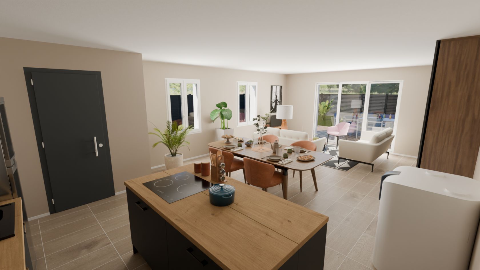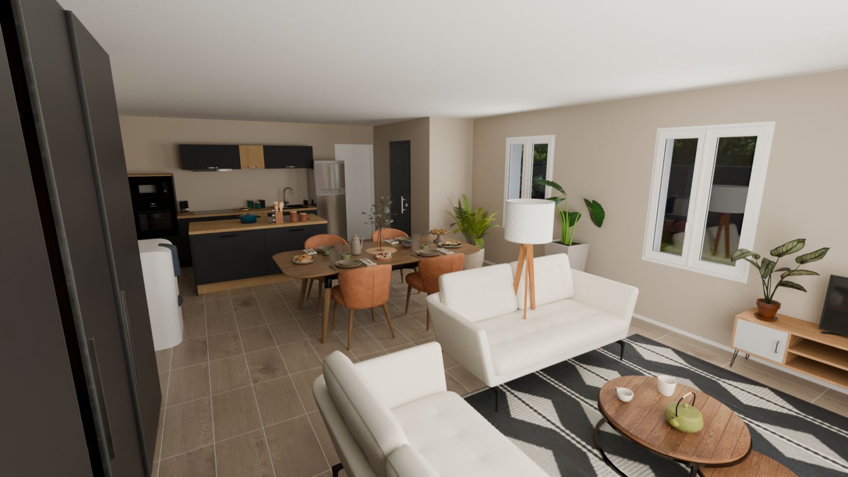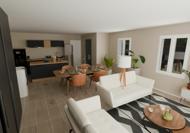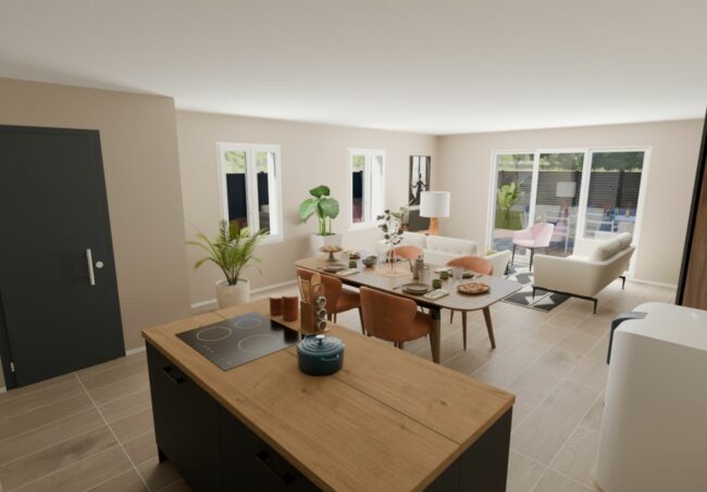 Profitez d’une spacieuse pièce de vie traversante de 43 m², baignée de lumière grâce à une grande baie vitrée, avec cuisine ouverte et cellier isolé pour plus de confort au quotidien.